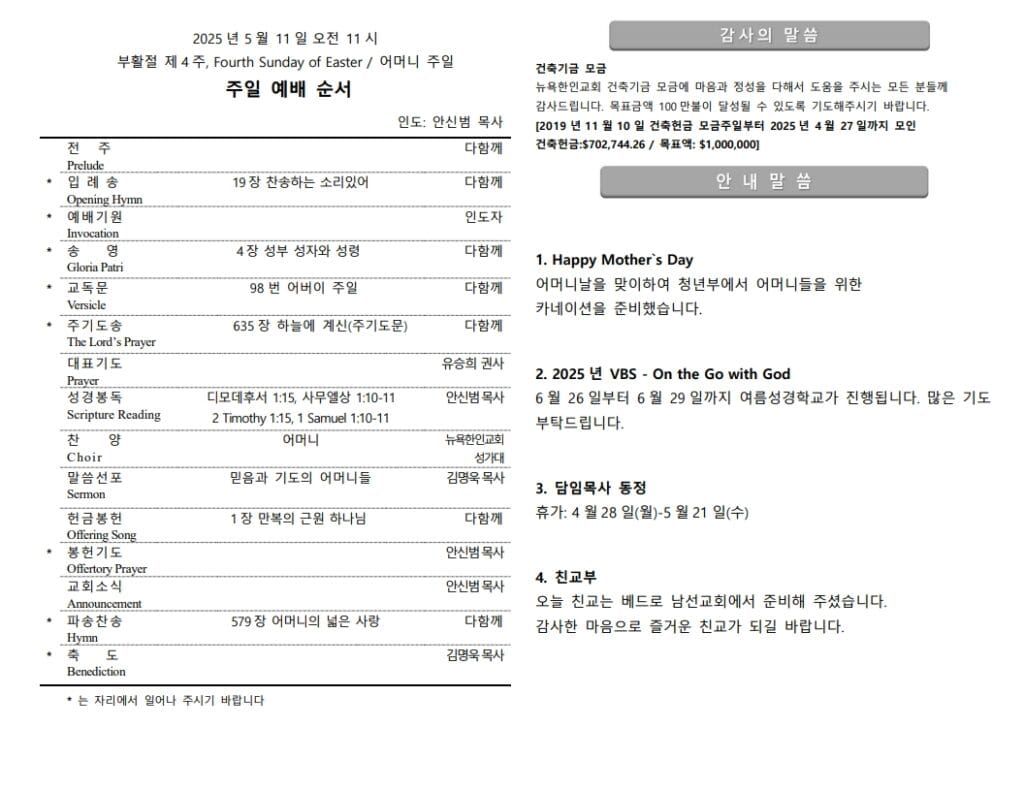Category: 주보By nykc.admin2025년 05월 11일Leave a commentAuthor: nykc.admin https://newyorkkoreanchurch.comPost navigationPreviousPrevious post:2025년 5월 4일 주보NextNext post:2025년 5월 18일 주보Related posts2026년 1월 18일 주보2026년 01월 18일2026년 1월 11일 주보2026년 01월 11일2026년 1월 4일 주보2026년 01월 04일2025년 12월 28일 주보2025년 12월 28일2025년 12월 21일 주보2025년 12월 21일12월 14일 주보2025년 12월 14일