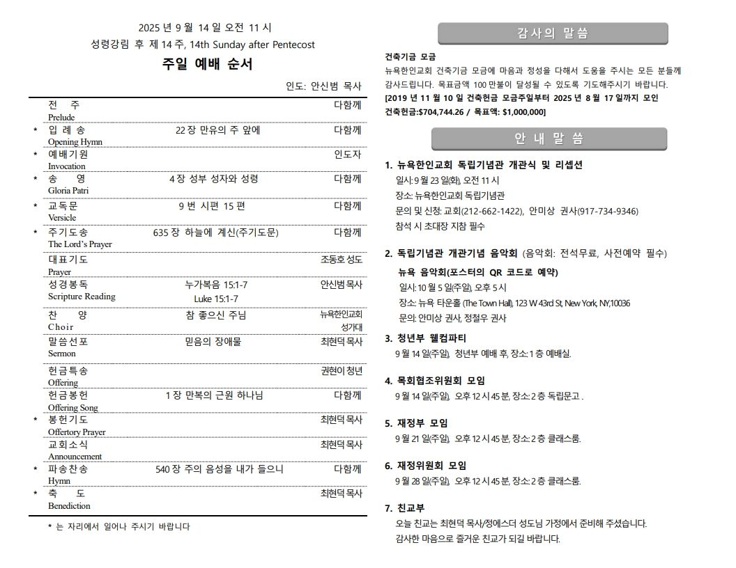 Category: 주보By nykc.admin2025년 09월 14일Leave a commentAuthor: nykc.admin https://newyorkkoreanchurch.comPost navigationPreviousPrevious post:야유회(2025.09.11)NextNext post:청년부 웰컴파티(2025.09.14)Related posts2026년 1월 18일 주보2026년 01월 18일2026년 1월 11일 주보2026년 01월 11일2026년 1월 4일 주보2026년 01월 04일2025년 12월 28일 주보2025년 12월 28일2025년 12월 21일 주보2025년 12월 21일12월 14일 주보2025년 12월 14일