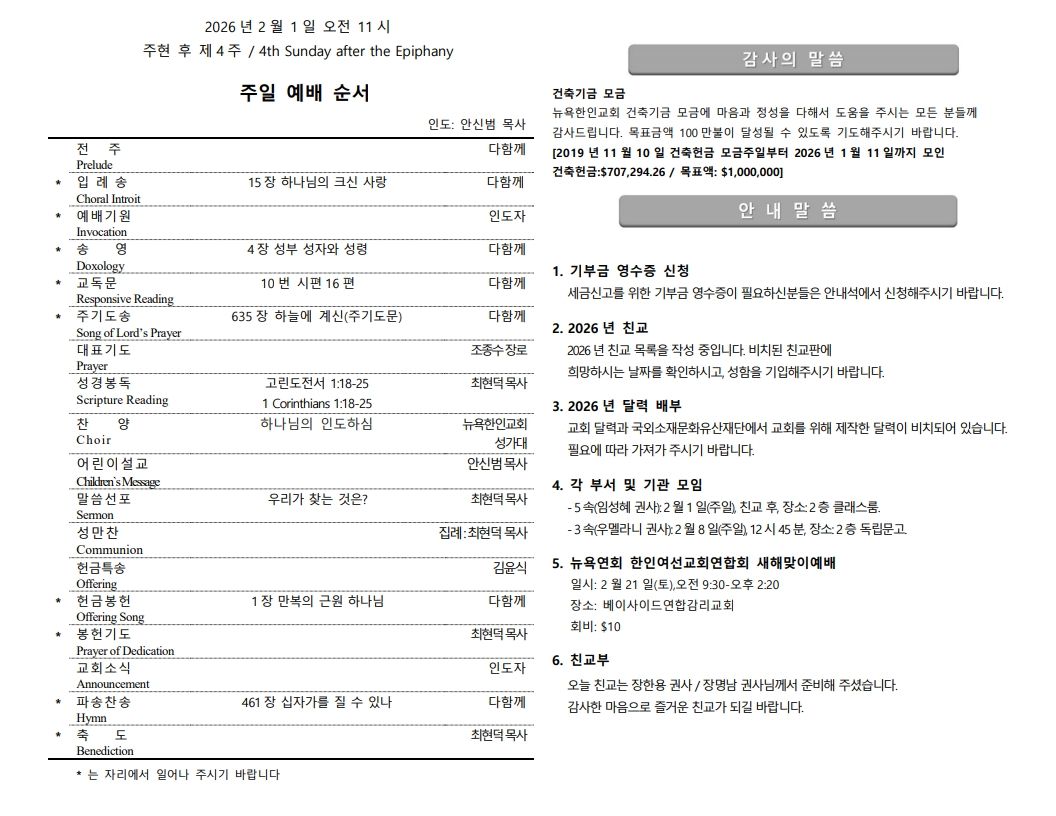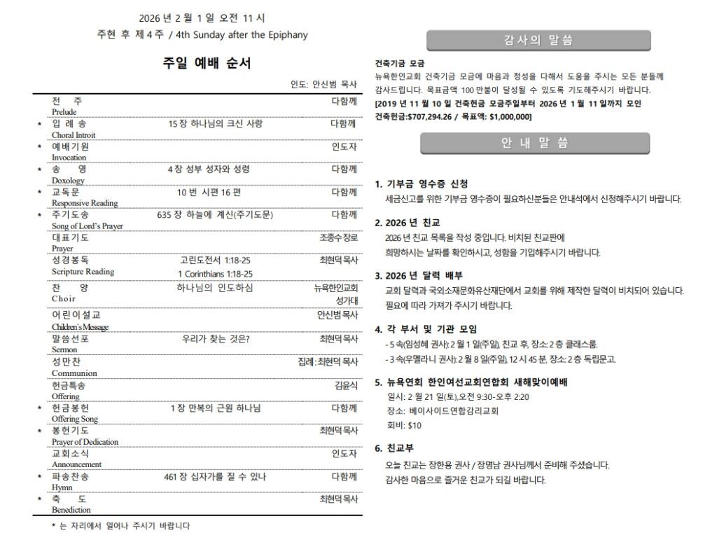 Category: 주보By nykc.admin2026년 02월 01일Leave a commentAuthor: nykc.admin https://newyorkkoreanchurch.comPost navigationPreviousPrevious post:2026년 1월 25일 주보NextNext post:2026년 2월 8일 주보Related posts2026년 2월 15일 주보2026년 02월 15일2026년 2월 8일 주보2026년 02월 08일2026년 1월 25일 주보2026년 01월 25일2026년 1월 18일 주보2026년 01월 18일2026년 1월 11일 주보2026년 01월 11일2026년 1월 4일 주보2026년 01월 04일