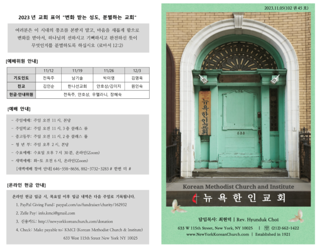 1. 모임 안내 신우회: 11 월 5 일(주일), 친교 후(12:45), 장소: 3 층 클래스룸 한나 선교회: 11 월 5 일(주일), 예배 후, 장소: 2 층 클레스룸 4 속: 11 월 19 일(주일), 친교 후, 장소: 2 층 클래스룸 2. 가을 대심방 2023 년 가을 대심방을 은혜로 잘 마쳤습니다. 동참해 주신 모든 성도님들께 감사드립니다. …