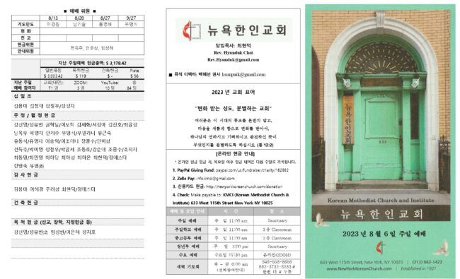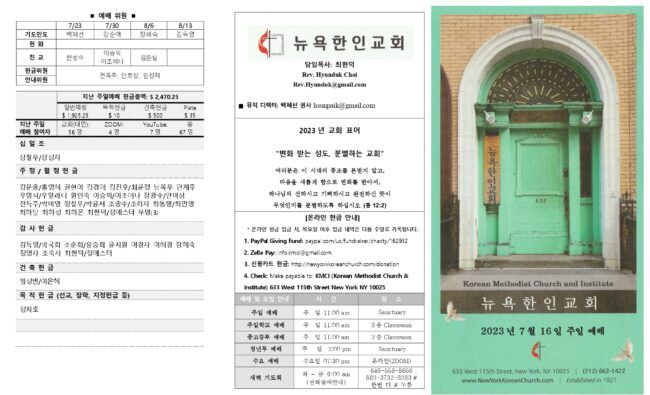 속회 모임 2속: 7월23일(주일), 예배 후, 장소: 2층 클래스룸 6속: 7월 30일(주일), 예배 후. 장소: 2층 클래스룸 예배를 위한 기도 모임 시간: 주일 10:30~10:45, 장소: 2층 독립문고 중보기도팀 모집 함께 교회와 성도님들을 위해 기도하실 중보기도 팀원을 모집합니다. 신청서를 작성하여 교회에 제출해 주시기 바랍니다. 2023 선교학교 Mission U (뉴욕연회 한인여선교회 연합회) Living the…