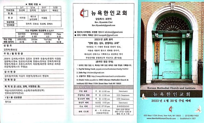 교회 대청소 주일 예배 후에 대청소를 실시합니다. 새가족 환영회 새가족 환영회를 준비합니다. 뉴욕한인교회 정식으로 등록을 원하시고 새가족 교육을 원하시는 분은 담임 목사님 또는 속장님에게 신청해주시길 바랍니다. 2023년 LIW-Met 합동 자방회 연회 롱아일랜드 동부 지방회와 메트로폴리탄지방회의 ” 비대면 연례 합동 지방회” 가 5월 6일, 토요일 오후1시, The First UMC in Jamaica, Queens에서 있습니다. 교인…