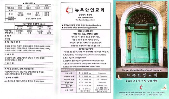 새가족 환영회 오늘부터 새가족 교육이 시작됩니다. 예배 후 1시에 3층 클래스룸에서 모입니다. 새가족 분들과 뉴욕한인교회에 정식 등록을 원하시는 분은 꼭 참석해주시기 바랍니다. 중보 기도 팀 5월 11일 목요일 오전10시30분에 예배당에서 중보기도팀 기도회 모임이 있습니다. 중보기도팀원 분들은 꼭 참석해 주시기 바랍니다. 선교 걷기 대회 일정: 2023년 5월 21일 일요일 예배 후 장소: 뉴욕 한인…