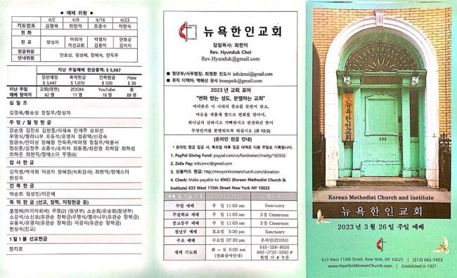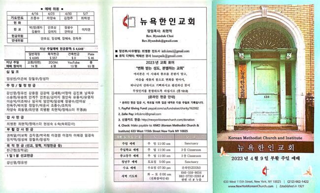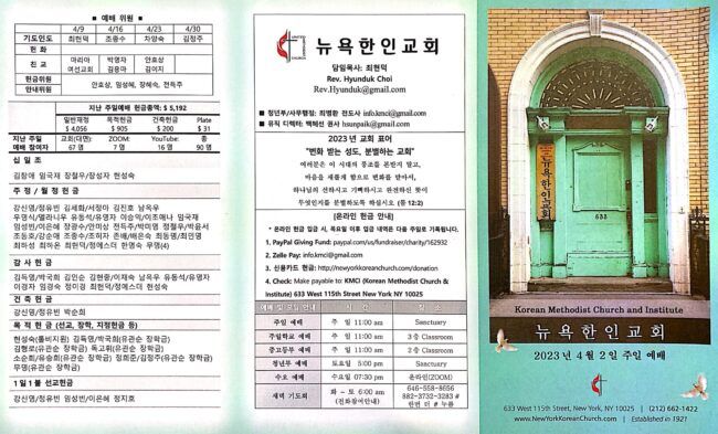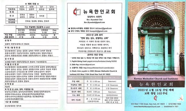 4월 예배 안내 4월 16일 교회창립기념 주일 2023 UMC 한인교회 미래 컨퍼런스 한인 연합 감리 교회 미래 컨퍼런스가 ZOOM으로 한인 목회 강화 협의회의 주관으로 열립니다. 일시: 2023년 4월 10일(월) 오후 3PM 등록: https://mailchi.mp/2ba9e7141431/9si75wgmj4-11544090?e=[UNIQID] 한인 여선교회 뉴욕 연합회 봄철 바자 *뉴욕 한인 연합회 여선교회에서 봄철 바자를 합니다. 1) 도토리 국수- 8.5파운드 박스 $42 2)…