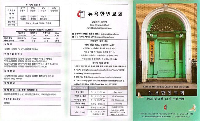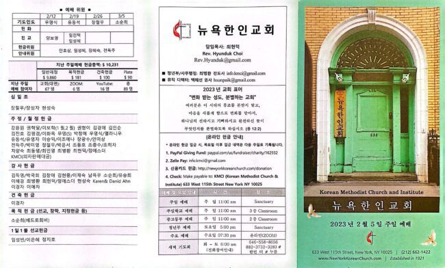 삼일절기념 장학생 공개모집 공고 뉴욕한인교회는 3.1절 뉴욕 102주년을 맞이하여 미국 내에 거주하는 한인 학생들에게 3.1절기념 장학생을 공개 모집합니다. 대상: 현재 미국 내에서 재학 중인 대학 및 대학원 한인학생 제출서류: 1. 재학증명서 응시자의 비전과 3.1절 (1-2Page) 원서마감: 2월 26일까지 (EST 기준) 제출처: info.kmci@gmail.com (*제출된 서류는 반환되지 않습니다.) 1절 마운트 올리벳 묘지 추모 예배 안내 2023년 3월…